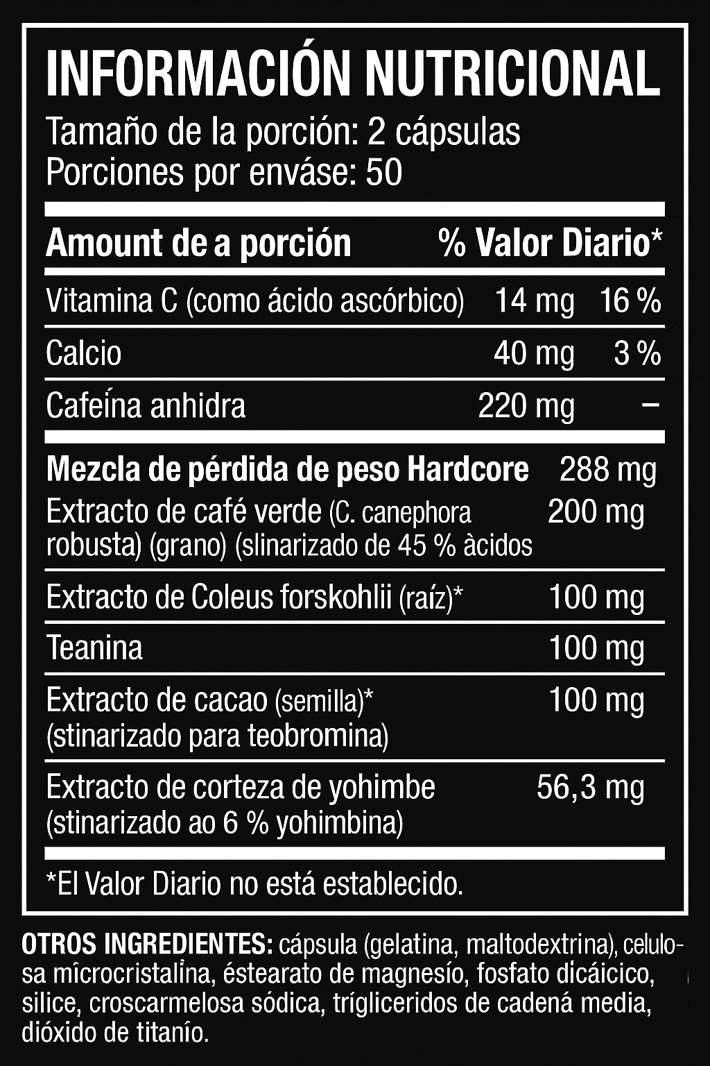 Extracto de yohimbe (corteza): 56.3 mg (estandarizado para 6% yohimbina)