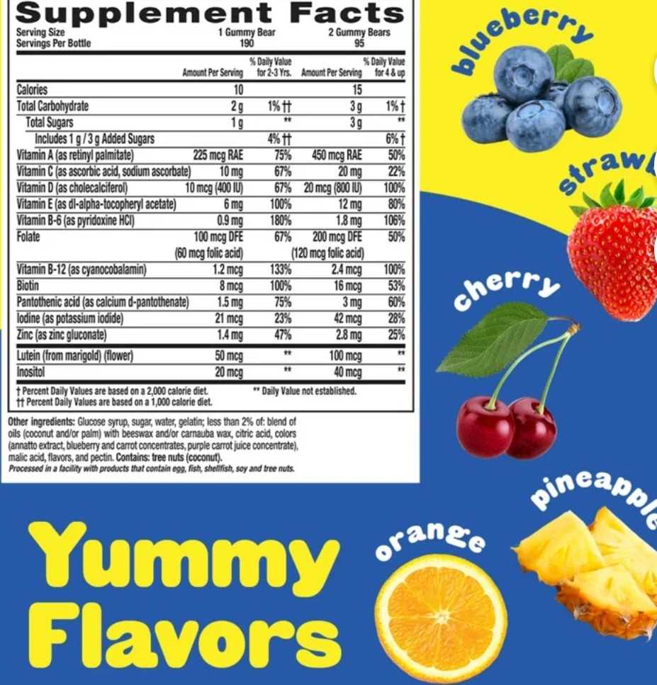 L’il Critters Gummy Vites es un multivitamínico completo en forma de gomita, ideal para apoyar el crecimiento y desarrollo saludable de los niños. Está formulado con una combinación balanceada de vitaminas esenciales que favorecen la inmunidad, la salud ocular, ósea y general. Su delicioso sabor a frutas (naranja, fresa, cereza, arándano y piña) lo hace fácil de incorporar en la rutina diaria de los más pequeños.