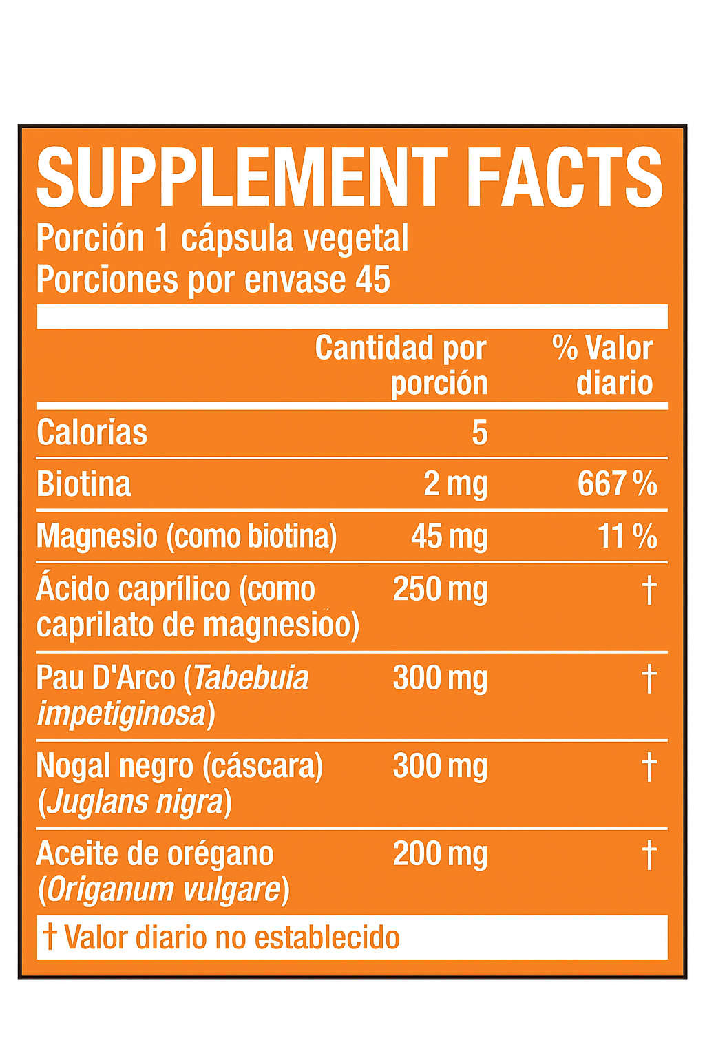 Con extractos naturales como Pau D’Arco, Nogal Negro y Orégano.