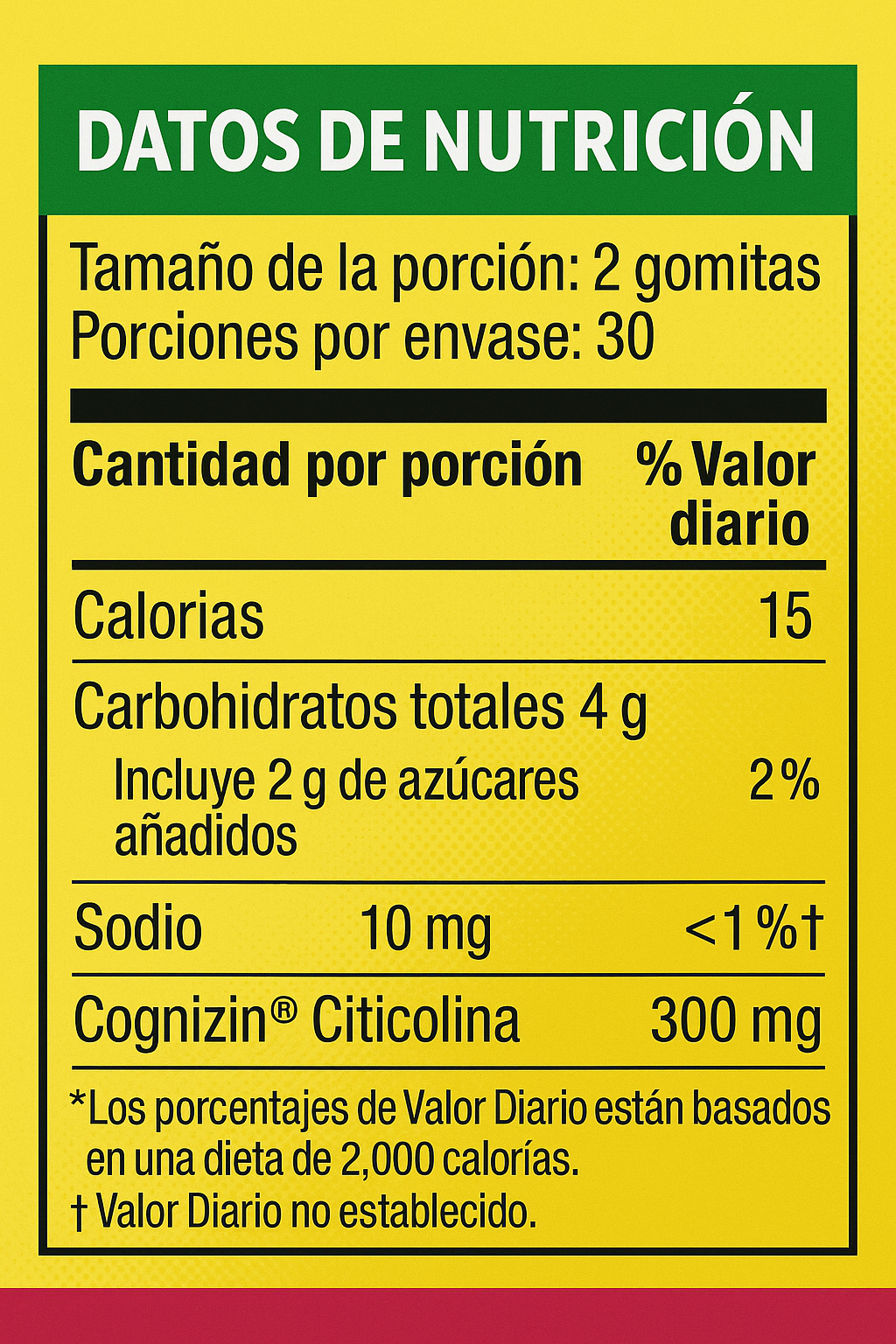 Datos nutricionales por porción (2 gomitas):